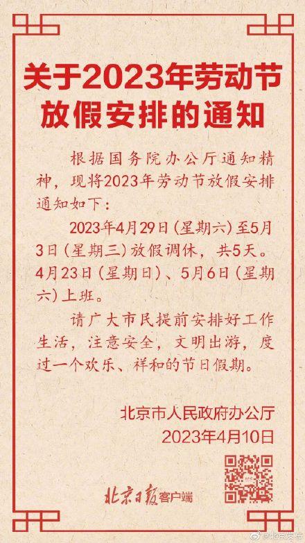 根據(jù)國務(wù)院辦公廳通知精神,現(xiàn)將2023年勞動(dòng)節(jié)放假安排通知如下:2023年4月29日(星期六)至5月3日(星期三)放假調(diào)休,共5天。4月23日 (星期日)、5月6日(星期六)上班。請(qǐng)廣大市民提前安排好工作生活,注意安全,文明出游,度過一個(gè)歡樂、祥和的節(jié)日假期。
